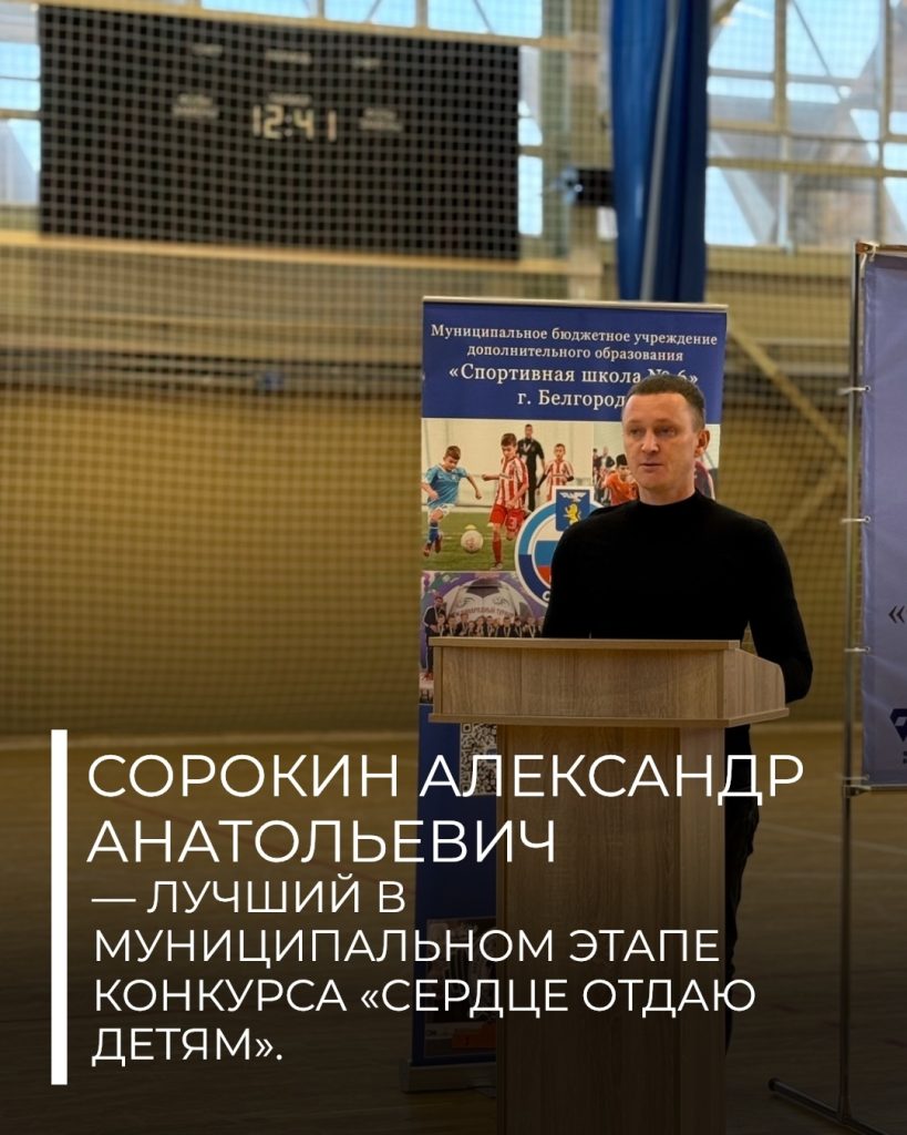 С гордостью и радостью сообщаем, что подведены итоги муниципального этапа Всероссийского конкурса профессионального мастерства работников сферы дополнительного образования «Сердце отдаю детям». 🏆Победителем стал наш тренер-преподаватель - Сорокин Александр Анатольевич! Александр Анатольевич блестяще прошел все испытания очного этапа. Эта победа - заслуженное признание его высокого профессионализма, таланта и безграничной преданности своему делу. Весь коллектив МБУДО СШ Nº6 поздравляет Александра Анатольевича с этим выдающимся достижением! Мы гордимся тем, что в нашей школе работают педагоги такого уровня. Желаем вдохновения, новых творческих свершений и, конечно, удачи на следующем, региональном этапе конкурса!❤️